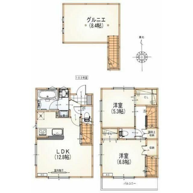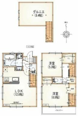 | 間取り | 2LDK(LDK12.8洋室6.8洋室5.3グルニエ8.4) | 主要採光面 | 南 |